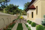 Gardul de incinta la str. principala, inalt de 2.10m, a fost gandit sa se armonizeze cu stilul de arhitectura al imobilului pe de o parte iar pe de alta, pentru a respecta regulamentul de urbanism si caracterul gradinii de tip frantuzesc. Am optat pentru reconfigurarea imaginii initiale a imprejmuirii traforate metalice pe soclu si stilpi din zidarie, care prezenta o imagine art nouveau, cu conditia ridicarii acesteia la un alt nivel calitativ. S-a schimbat pasul traveii de gard, desimea elementelor metalice de compunere ale panourilor, inaltimea totala a acestuia.